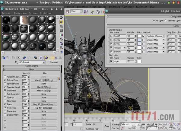 七、灯光 采用了点光源、聚光灯、泛光灯,以3点布光发。灯光整列模拟全局光,要求使用者对光和光的传递方式有较深刻的认识,我的灯光比较的简单。灯光的设置也可以看个人的喜好。主光源一个淡蓝禄色的目标平行光,角色后面加一个深蓝色的补光,烘托出神秘气息。在比较暗的地方打几盏点光源。注意有个冷热对比,感觉差不多,把渲染质量调到最高进行最后的产品渲染。