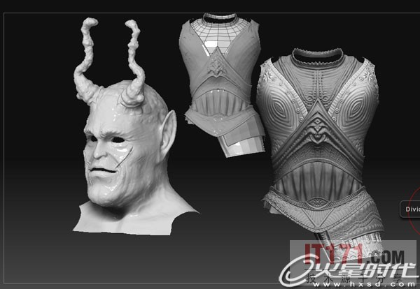 在zbrush里面我导入之前做好的低面人物,进行多次细分,逐步雕刻。zb最大的优势在于整体的把握,即便是一些小小的皱纹都能雕刻出来,这就要求对模型的理解能力以及自己的造型能力。在导入之前检查一下uv是否合理。逐步把盔甲的纹理表现出来,使形体逐渐完善。