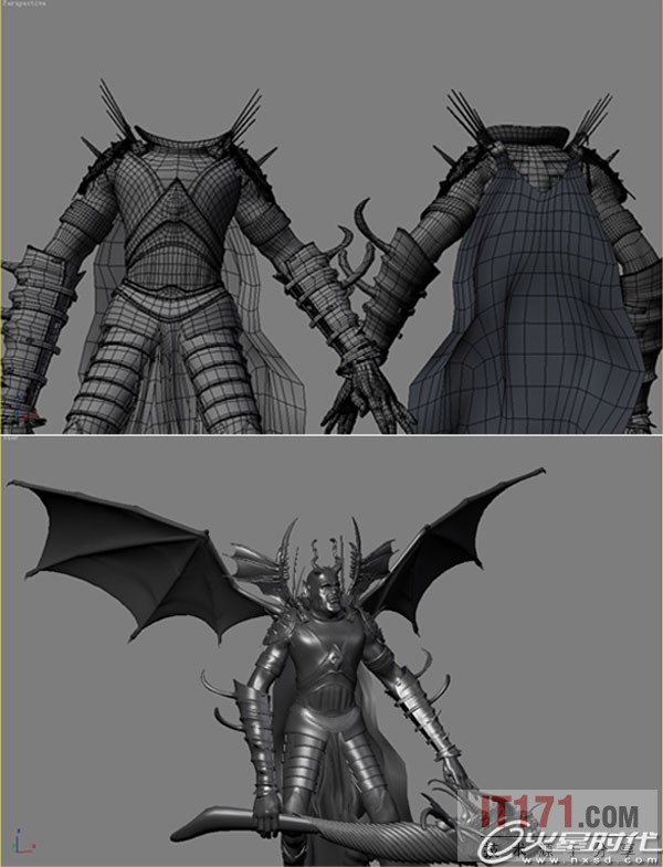 接下来是身体装备的制作。因为做的是静帧,我没用按照原有的设想完成,只单独做了盔甲与四肢。导致后来角色的绑定无法完成动作的设定,这是一个致命的错误。