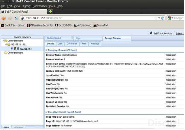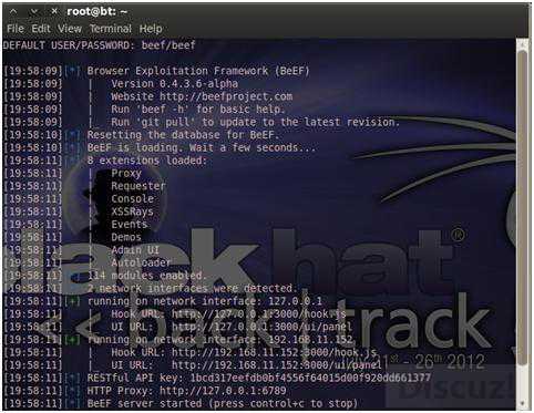 命令行中显示的UI URL以后即为WEB接口,用浏览器打开,输入默认密码beef/beef,即可进入BeEF管理页面