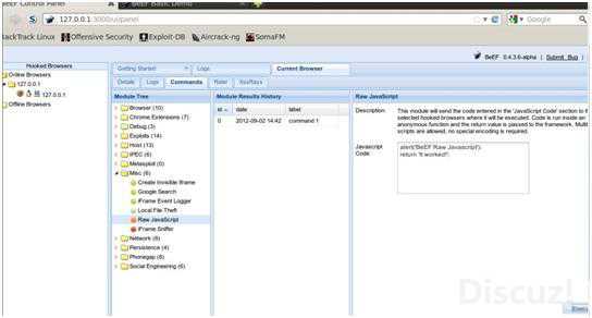 例如,选取MISC下的Raw JavaScript模块作为测试用例,右端表格有该模块的详细说明,以及一些可选的参数等。输入Javascript code,点击Excute进行攻击,效果如下图所示