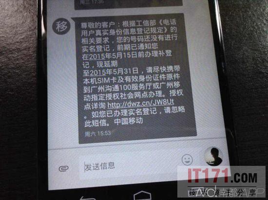 近日有用户收到了10086发来的短信称:根据工信部《电话用户真实身份信息登记规定》的相关要求,您的号码还没有进行实名登记,前期已通知您在2015年5约15日前办理不登记,现延期至5月31日,请尽快携带本机SIM卡以及有效身份证原件到广州沟通100服务厅或广州移动指定授权社会网店办理。