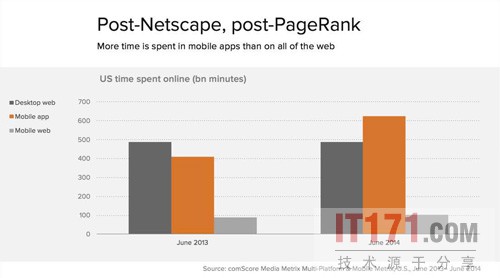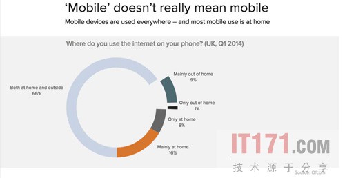 本文作者比尼迪克 艾文原就职于于硅谷顶尖风投机构,并参与Facebook, Twitter, Airbnb等投资。这两个图表显示了现今大多数人对移动设备的看法。首先,我们可以看到,人们利用移动设备使用大量流量,其次,绝大多数的互联网流量(以美国大部分地区为例)和移动流量都不是上网产生,而是通过app消耗的。不过,如果你考虑不够仔细,很有可能因此产生误解。首先,让我们来看看人们到底都是在哪用这些移动设备的。这张图片上你可以看到,所有相关的数据均显示,(以使用cellular和WiFi为例)人们一般在家里、公司或咖啡厅时最可能使用移动设备,而不是像人们想的那样,只有在路上走或在商店排队的时候才用。人们时时刻刻都在用着这些设备,但用的最多的通常是在他们坐着的时候。上述有关IBM公司的数据,像其他很多“移动”数据那样,实际上也包含平板电脑在内,这也算是一条线索吧——人们得坐下来才能用平板电脑,同理,智能手机也是这样。当我们谈论移动应用的设计时,我们谈论的往往是创建移动体验——尽管只是瞥了一眼,人们就可以在短时间内将手机一览无余,因为那时候他们可能需要排队、走路或等电梯什么的。随着发展,移动体验变得可能,或者说,必须只是全面体验的一部分而已。事实上,人们确实是这样做的——他们在走路时可能会时不时看看手机,但同时,他们也渐渐把越来越多,甚至半个小时的时间全都用在上网或其他app上,即使他们当时可能正坐在家里,而旁边也有笔记本。所以说,移动体验仍然有待完善。但矛盾的是,这对你而言可能意味着全面体验都需要改变以适应人们使用习惯的改变。只将提案中的一小个点子放在移动设备中可能是件很冒险的事——毕竟,这是你与用户唯一的触点。相反,人们可以说,在某些情况下,桌面体验也应该是移动体验的一部分。其次是关于app应用分享。使用最多的app当然Facebook和YouTube,但事实上,在互联网界,人们使用的app都高度集中在了那少数几个非常成功的app上。如果你观察人们的电脑桌面来了解他们的网页使用情况,你会发现很多地方惊人得相似。大多数人都会有10到20个固定的访问网站,他们通过输入网址或点击保存的书签或(最有可能通过)搜索网站名称上网。他们所有的信息都是通过社交网站或搜索引擎得到的。而对于移动设备,同样,大多数人会有约10到20种经常使用的服务——如果换作智能手机,就是约10到20种app。他们所有的信息都是通过搜索或社交得到的——社交类中,Facebook或Twitter里内置的用来加载网页的服务除外,这些也算在app应用里。换句话说,将应用分为移动设备版和电脑版是种非常愚蠢的做法,在移动设备上的用的是app,而在电脑上,这些通常就存在网页浏览器里。App将那些顶端服务纳入到他们自己的应用程序中。但其他方面的改变却很少——这些服务绝大多数还是依附在网页上。写到这里,如果你使用的某些服务建议你在桌面上建立图标,并明确给了你提示做选择,那么你可能同时就有了一个应用程序和一个网址。如果你照做了,那么相对于电脑互联网而言,一切都改变了。但如果没有,那么对你而言网页、搜索引擎和社交软件仍是主要工具。因此,目前最有趣的现象就是人们企图将网络体验与本地非网络体验联系起来。我们可以通过Google Now 和Facebook Messenger,(你下订单所在的桌面网页,会同时登陆Facebook,在Messenger中给你发信息)以及很多谷歌考虑使用Chrome的其他应用服务看到,但至少现在还不是,移动设备和app的未来。