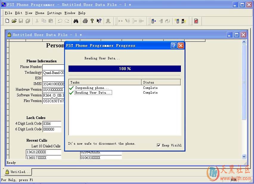 四、接着PST就开始读手机的相关信息了,到达100%就已经完成了,如下图: