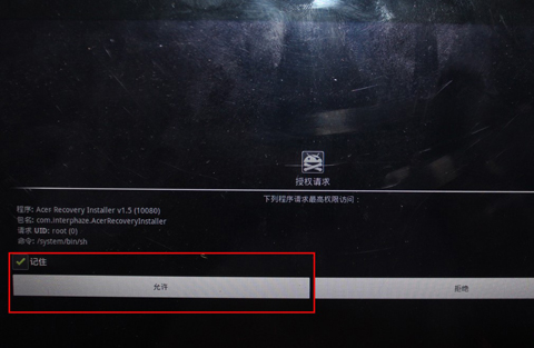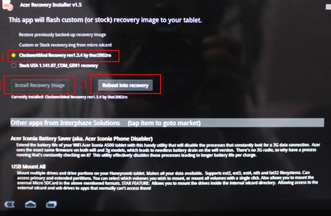 同样打开文件管理器找到TF卡里的AcerRecoveryInstallerV1.5点击安装,安装好后打开软件(打开软件后会跳出root权限。只时我们点“允许”)选择1:clockworkmod recovery.........”,然后点下面的2:install recovery image.如图。一会好了就点OK(好了选择3:reboot into recovery会重启进入刷机界面如果不进入刷机界面.那我们就关机)